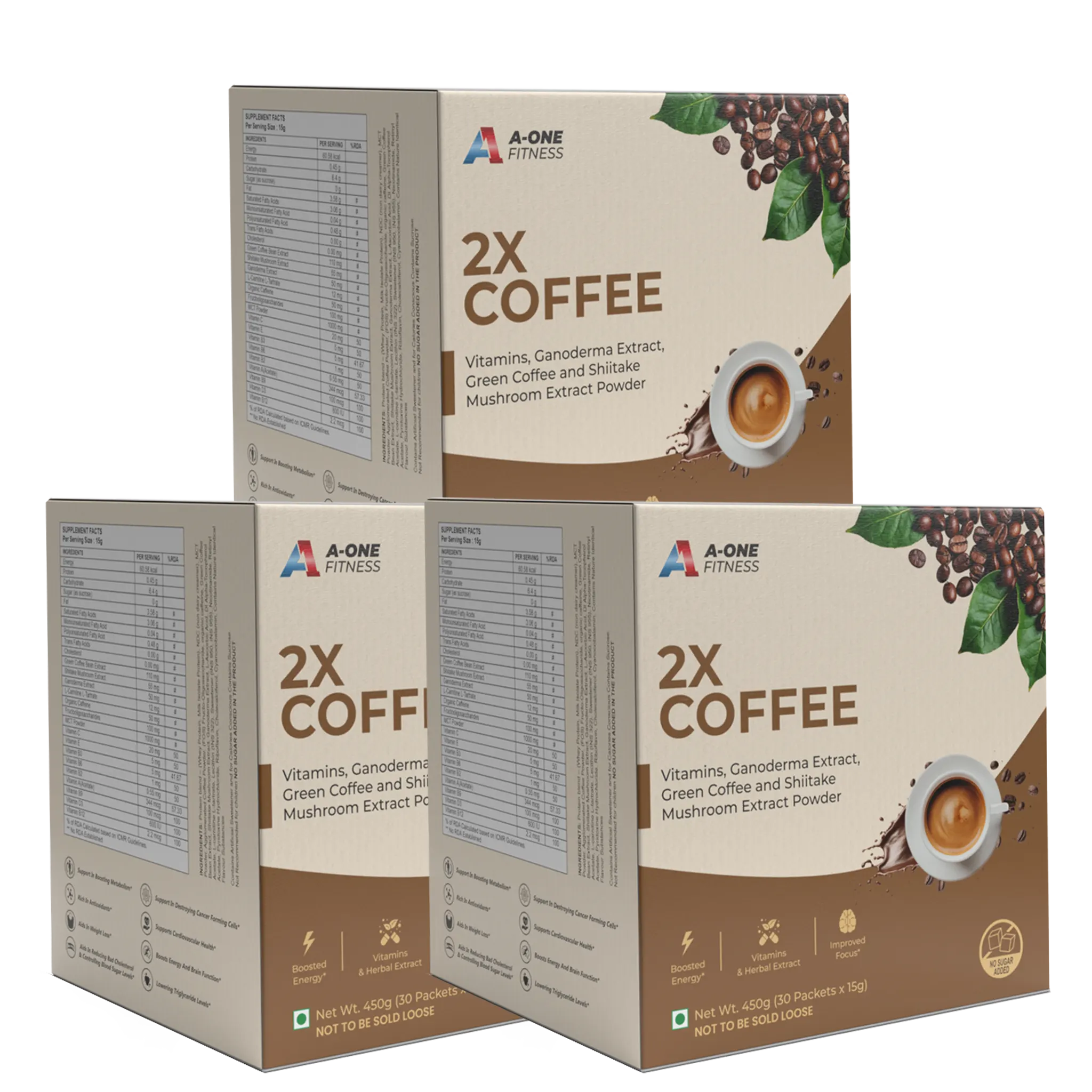 2X Coffee is a double-strength herbal coffee enriched with Ganoderma, Green Coffee, and Shiitake Mushroom Extracts. It supports sustained energy, improved focus, and overall wellness — with no added sugar.